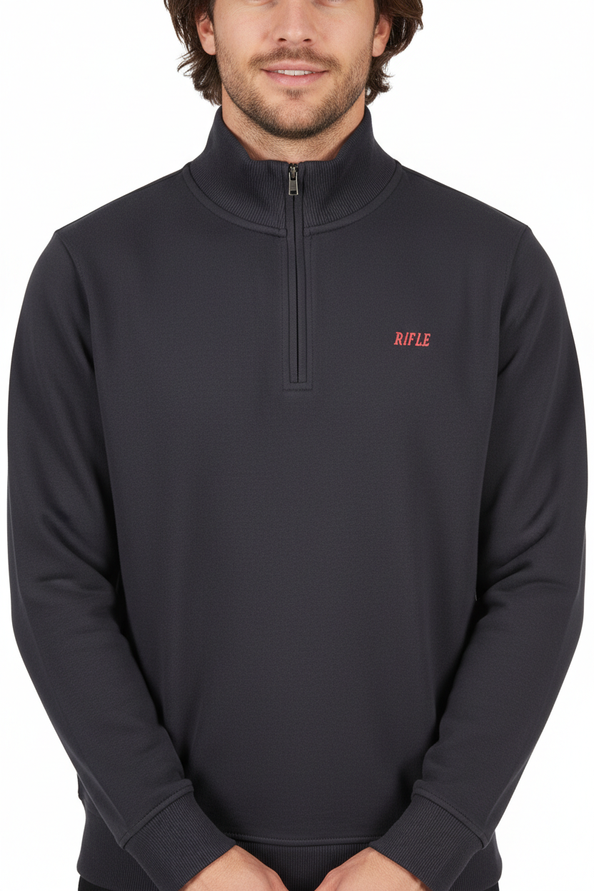 Caratterizzata da una pratica mezza zip, permette di regolare facilmente la vestibilità, mentre la stampa in rilievo aggiunge un tocco distintivo e alla moda. Il logo distintivo di Rifle completa il look, rendendo questa felpa non solo un capo essenziale del vostro guardaroba, ma anche un'affermazione di stile.